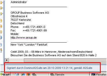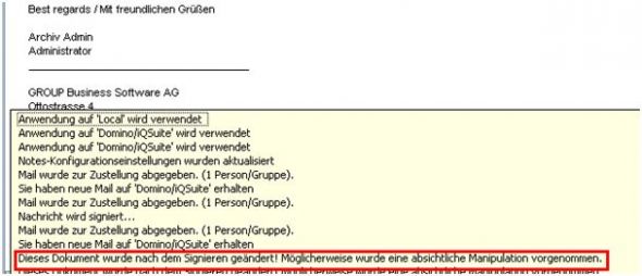 Wenn an unternehmensinternen E-Mails ein Trailer angehängt werden soll, aber Mitarbeiter ihre E-Mails digital signiert haben, bekommt der Empfänger eine Benachrichtigung, dass die E-Mail verändert wurde.