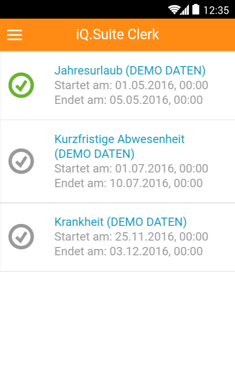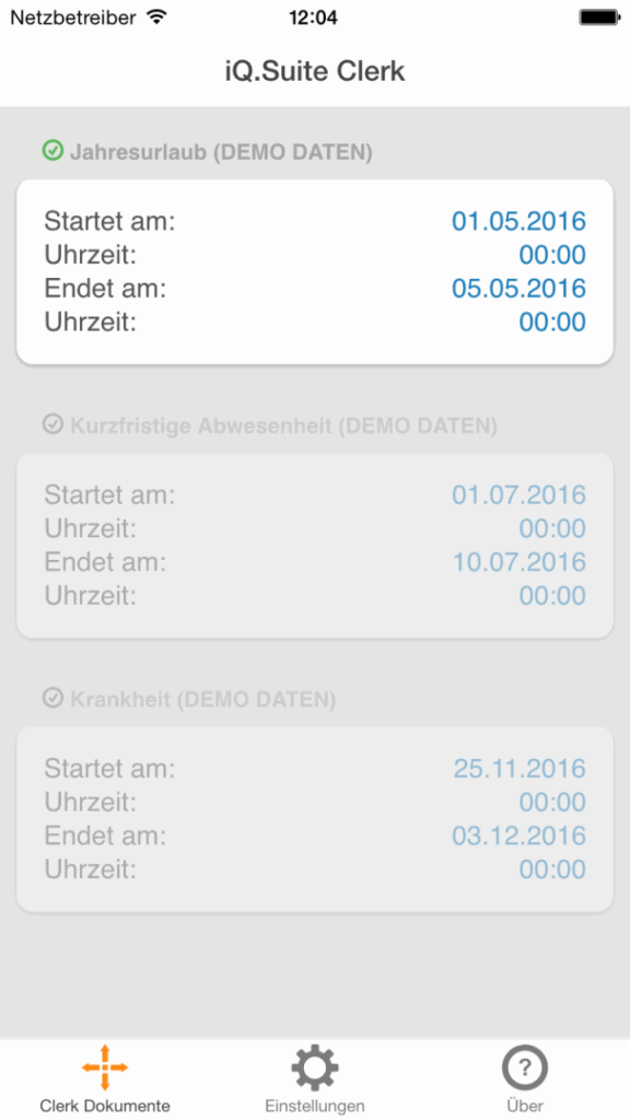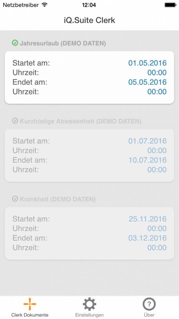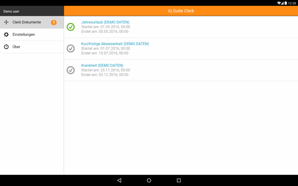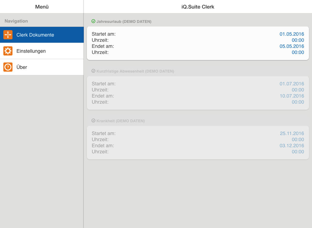 Beim erstmaligen Start der iQ.Suite Clerk App kommen Demo-Daten zur Ansicht. Diese, in der App gespeicherten Beispiele, dienen dazu, schnell und einfach die Möglichkeiten der App kennenzulernen. Da die Daten lokal vorliegen, können die Beispiele auch offline verwendet werden.