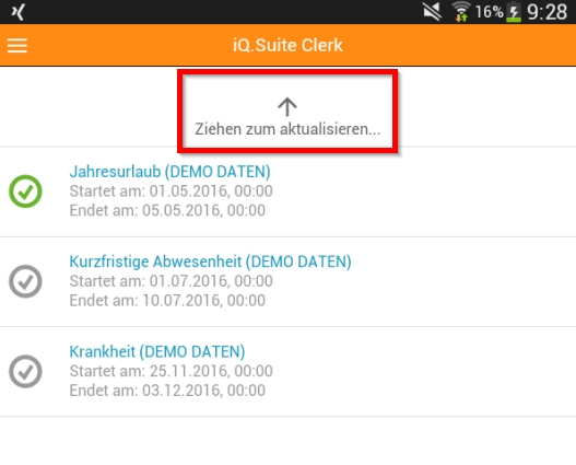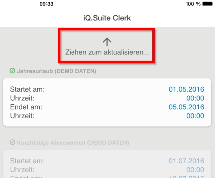 Nach dem Wechsel zwischen Demo- und Produktiv-Modus, oder um im Notes-Client neu erstellte Clerk-Dokumente in der App anzuzeigen, ist eine Aktualisierung der Clerk-Dokumente Ansicht erforderlich. Die Aktualisierung erfolgt über „Ziehen zum aktualisieren“.