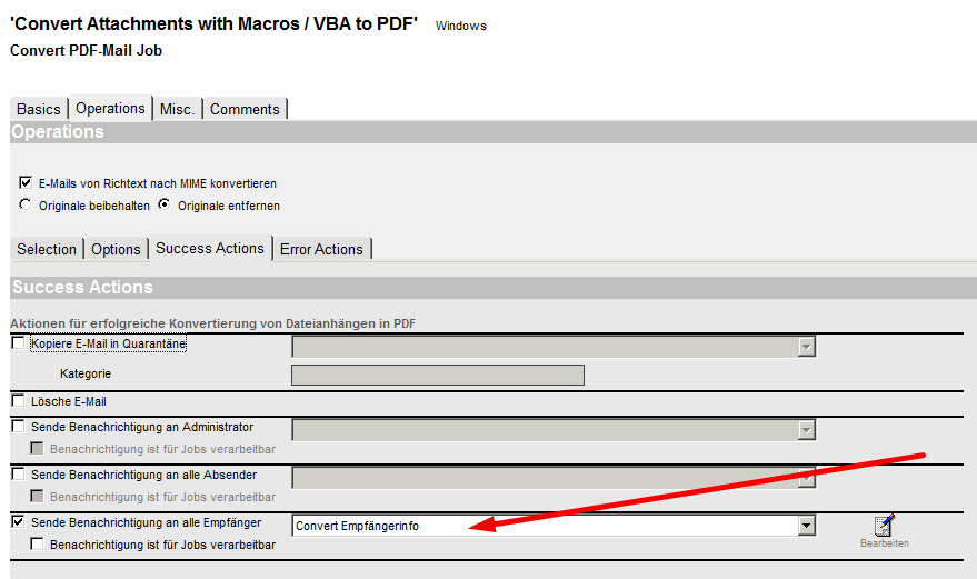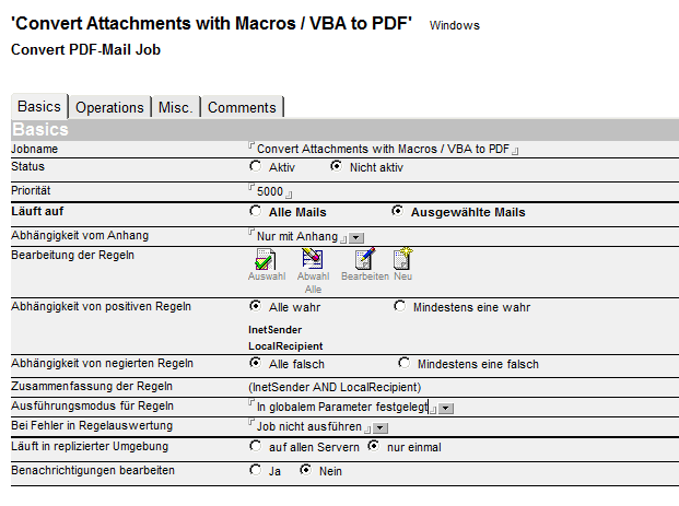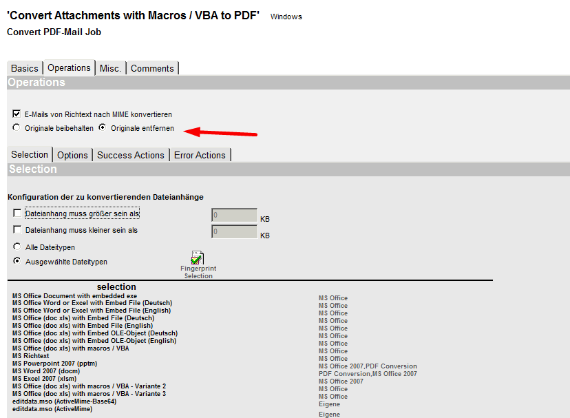 Um das Makro-Dokument dem Benutzer zuzustellen, wird dieses mit Hilfe von iQ.Suite Convert in eine PDF-Datei umgewandelt. Im dafür notwendigen iQ.Suite Convert Mailjob werden die gleichen Fingerprints ausgewählt wie zuvor im Dateieinschränkungsdokument.