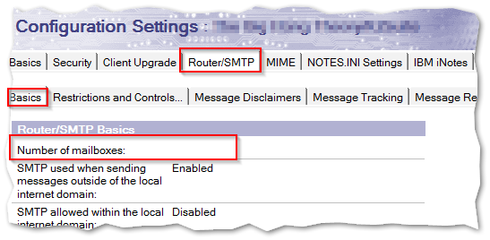 Wenn im Konfigurations-Dokument des Servers im Reiter Router/SMTP -> Basics bei Number of mailboxes nichts steht, hat der Server nur eine Mailbox (mail.box) und steht dort eine Zahl (z.B. 2), hat der Server 2 Mailboxen (mail1.box, mail2.box). Dies ist zu beachten, wenn die E-Mail nach der Verarbeitung gesucht wird.