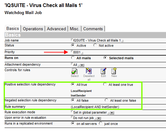 Der Job ist in der Priorität niedriger als der Hauptjob. Der Job läuft in Abhängigkeit derselben Regeln wie der Hauptjob. Zusätzlich muss die Regel, ob der Virenscanner 1 gelaufen ist, aktiv sein. „Ausführungsmodus für Regeln“ muss „Unmittelbar vor dem Job“ sein.
