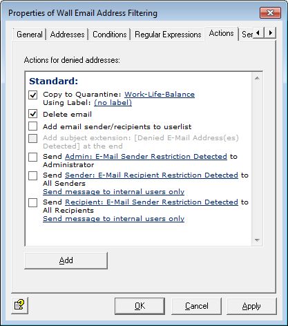 Nun muss nur noch die entsprechende Quarantäne unter Aktionen ausgewählt werden. Der Haken „E-Mail löschen“ verhindert, dass die E-Mail trotz Kopieren in der Quarantäne dem Mitarbeiter zugestellt wird.