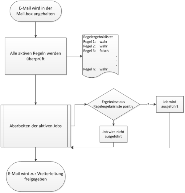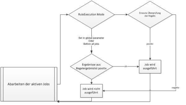 Ablaufdiagramm: Der Standardablauf beim Überprüfen der Regeln und die Ausführung der Jobs sehen vereinfacht wie oben aus.