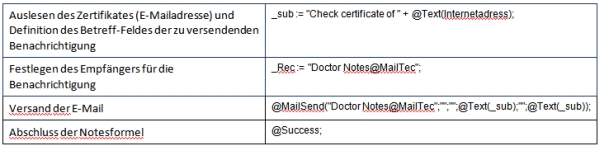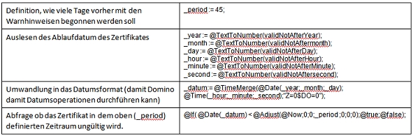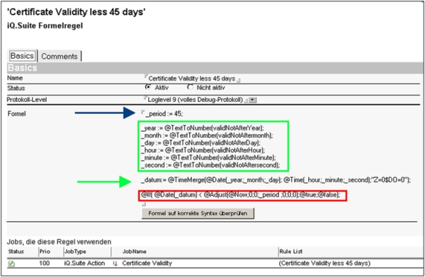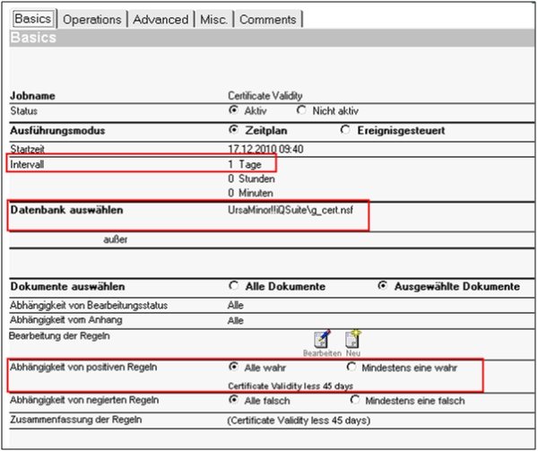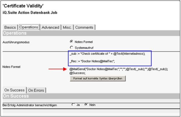 Dann wird ein Datenbank Aktionsjob benötigt, der regelmäßig (einmal am Tag) die Zertifikate in der Zertifikatsdatenbank (iQSuite/g_cert.nsf) überprüft und wenn die Regel wahr ist, eine E-Mail versendet. Erläuterung: Intervall: