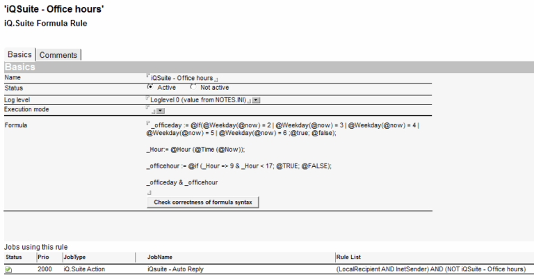 The created rule “iQSuite – Office hours” should be set to negated dependency, to ensure that automated notifications are sent OUTSIDE of office hours. Further rules may be added as needed.